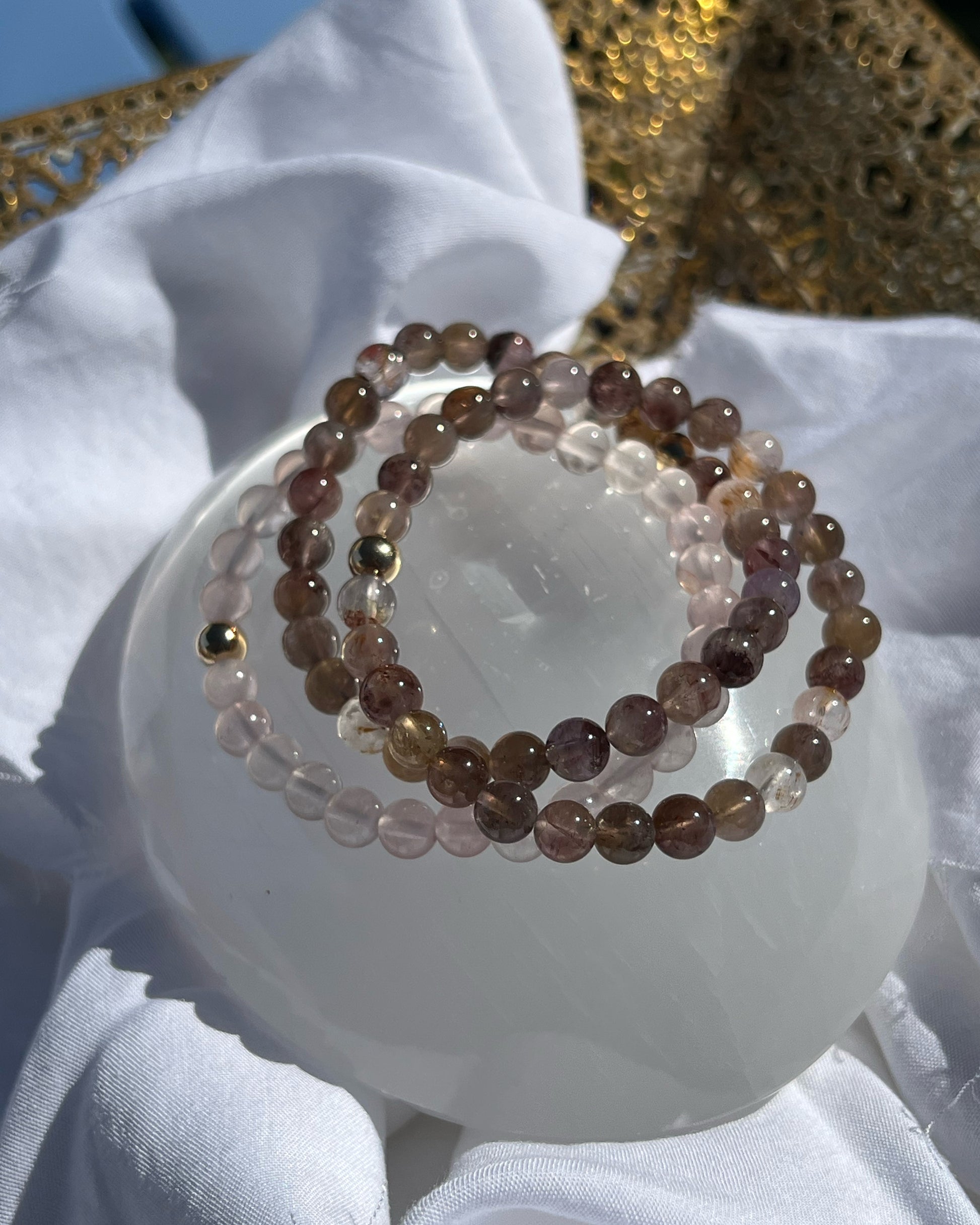 This stack has three bracelets which are shown in the photos. Two 6mm Auralite and one 6mm pale Rose Quartz. Each bracelet has a single 14kt gold filled bead.