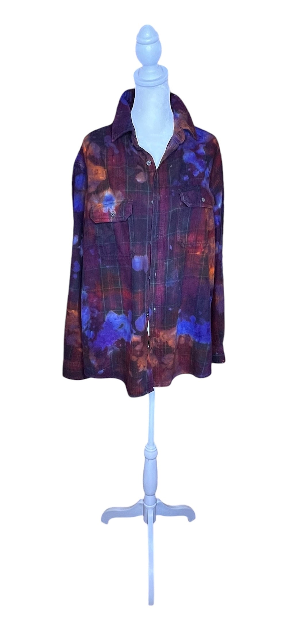 Item is unisex sizing. Each flannel is up cycled and hand dyed, making for a one of a kind piece.
