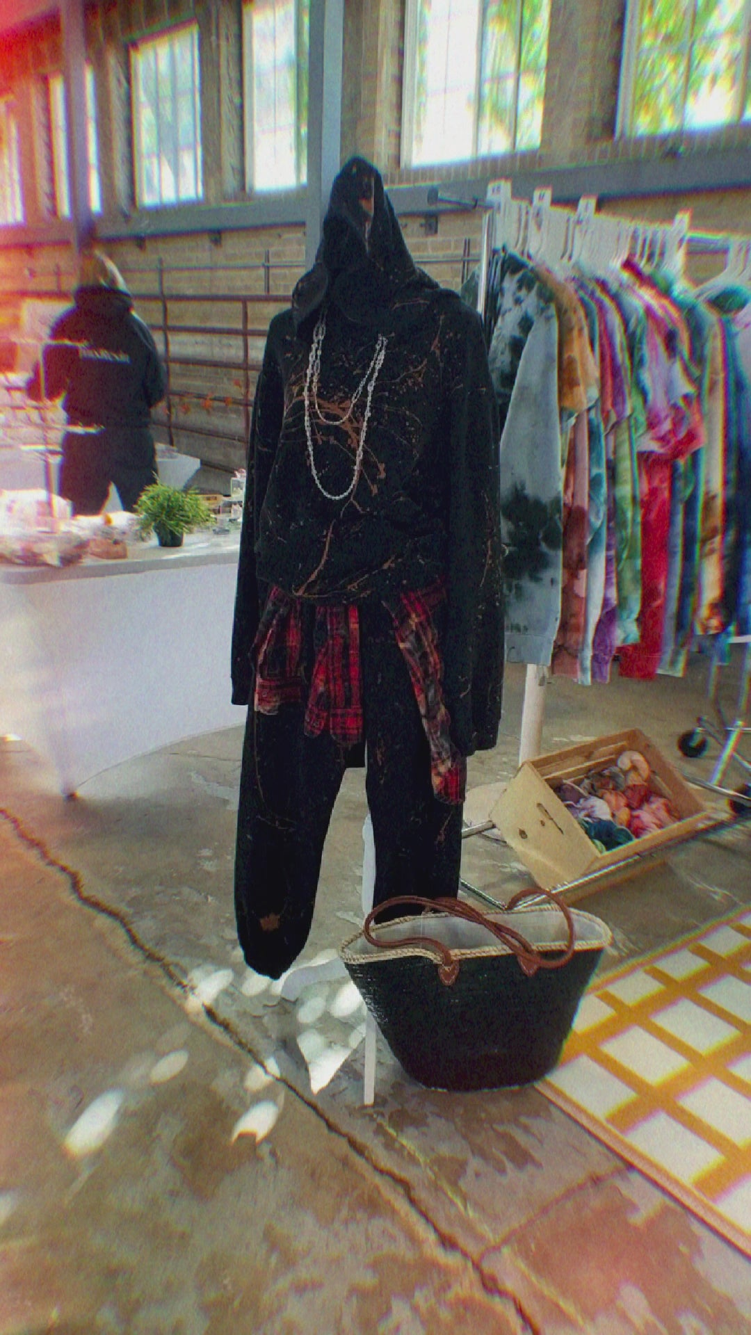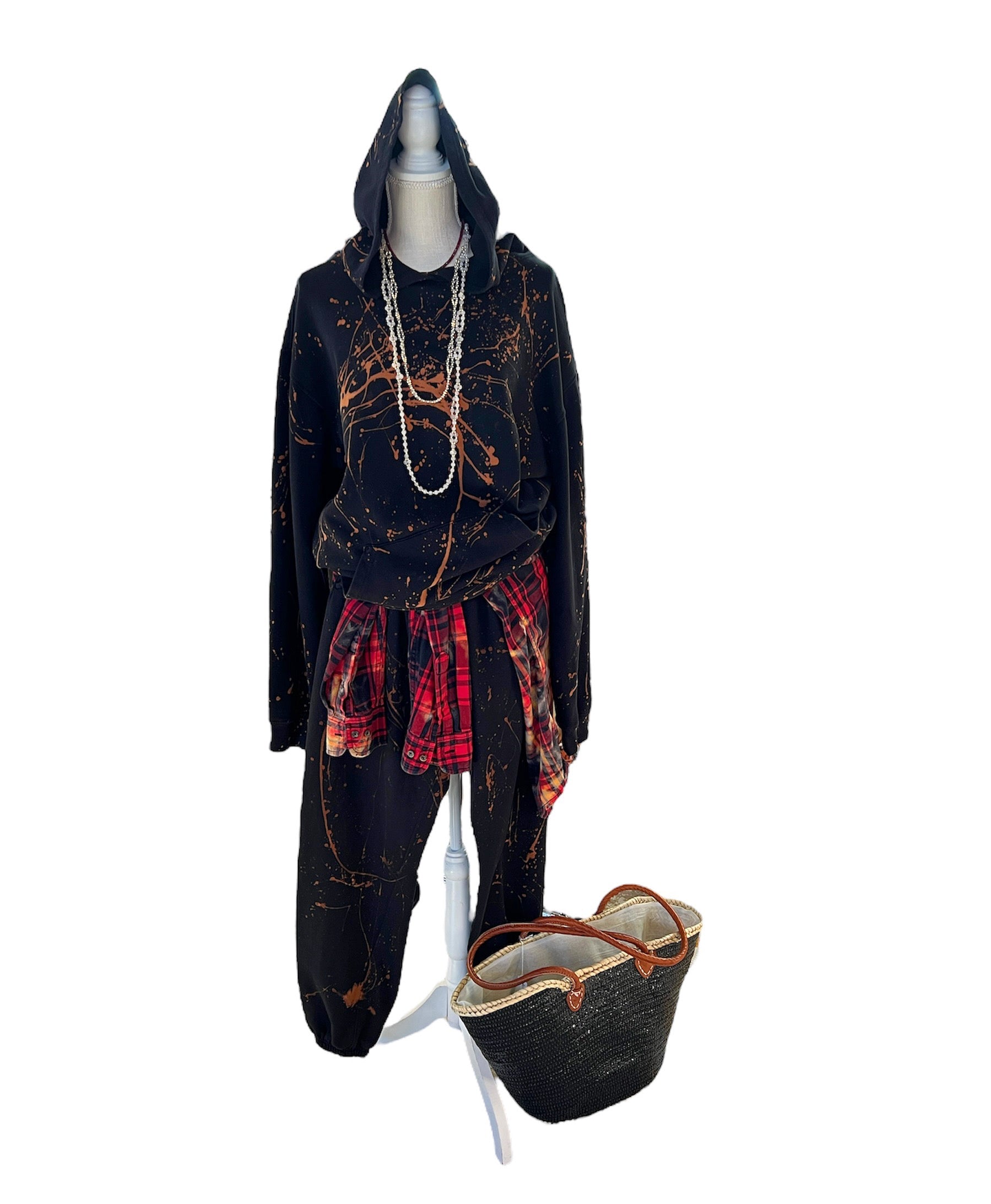 Black French Terry hoodie with matching sweatpant. A set to be had! Cosmic spirals with splashes of gold and copper made this one a show stopper. Let’s stroll into sweater weather looking and feeling good.