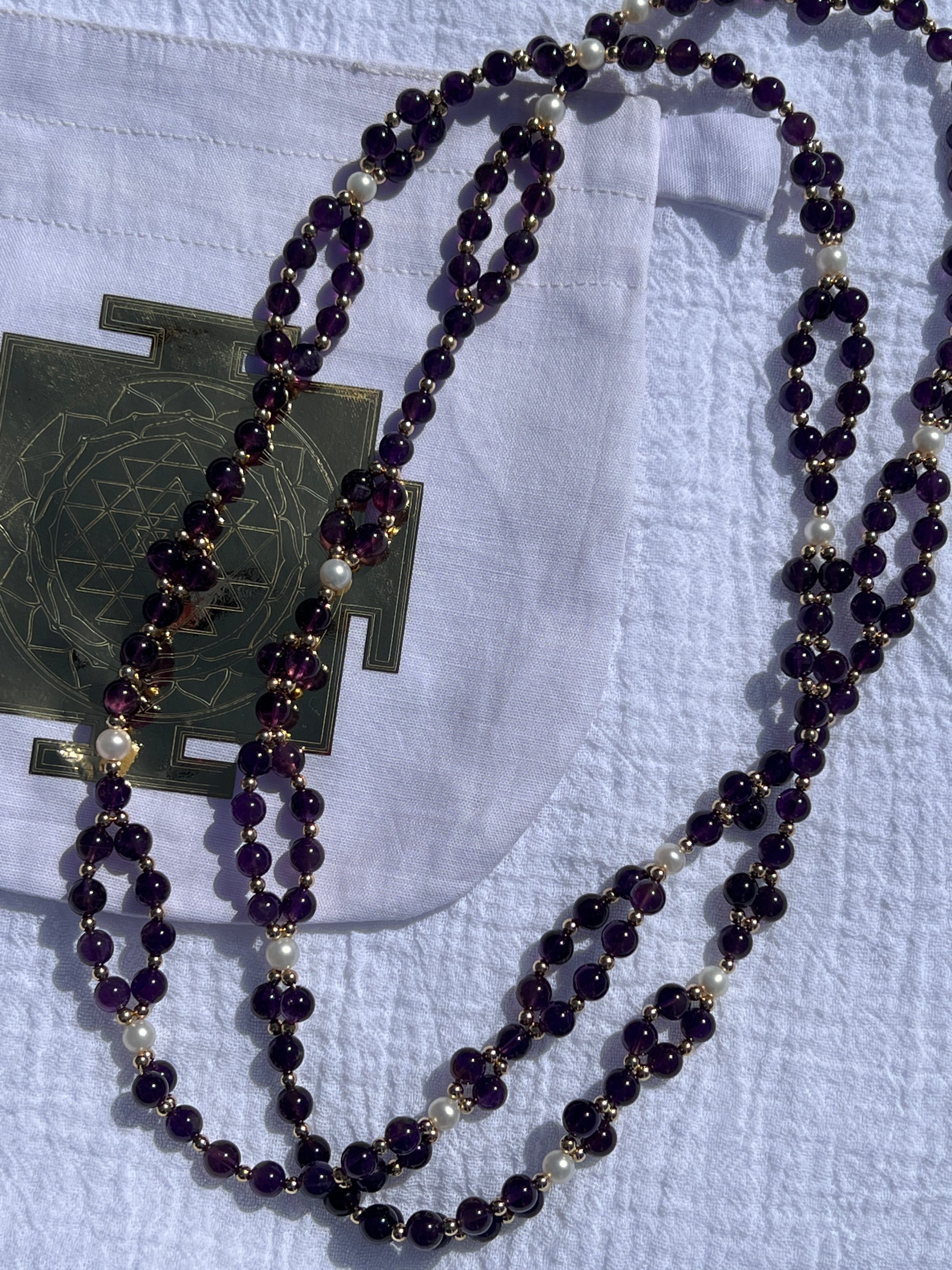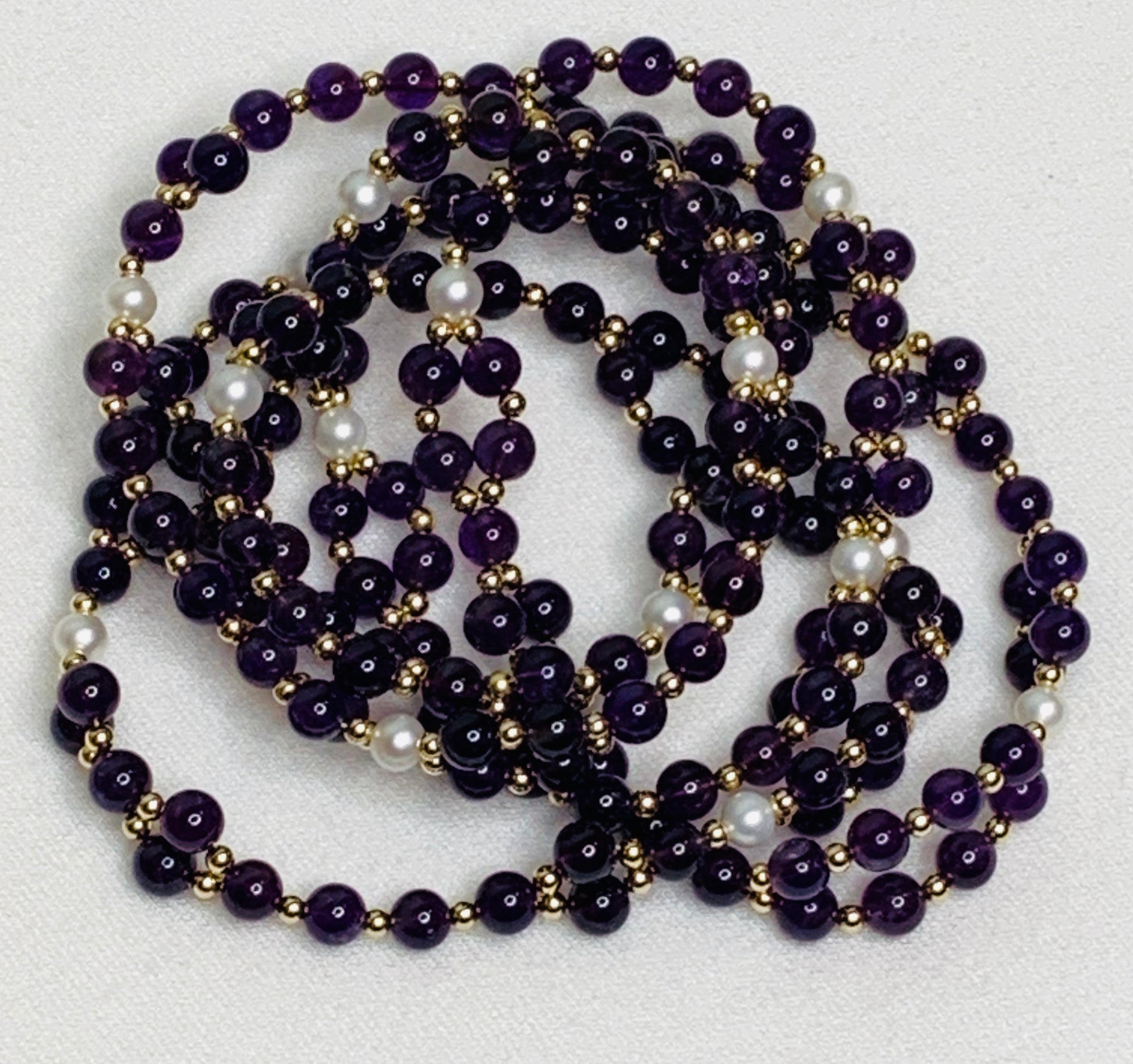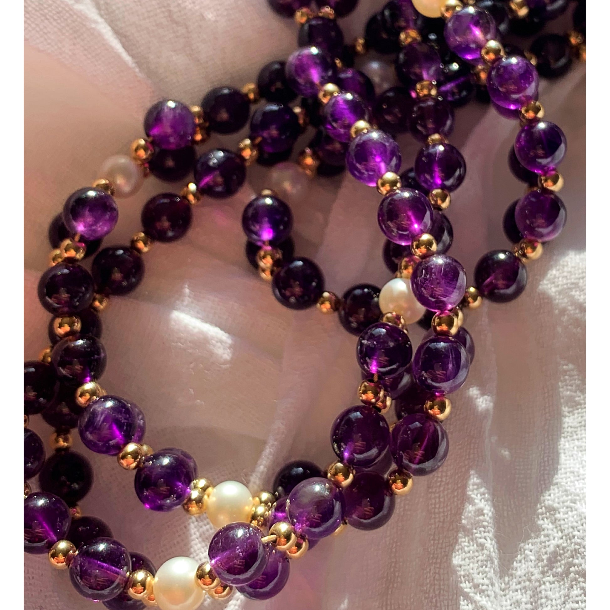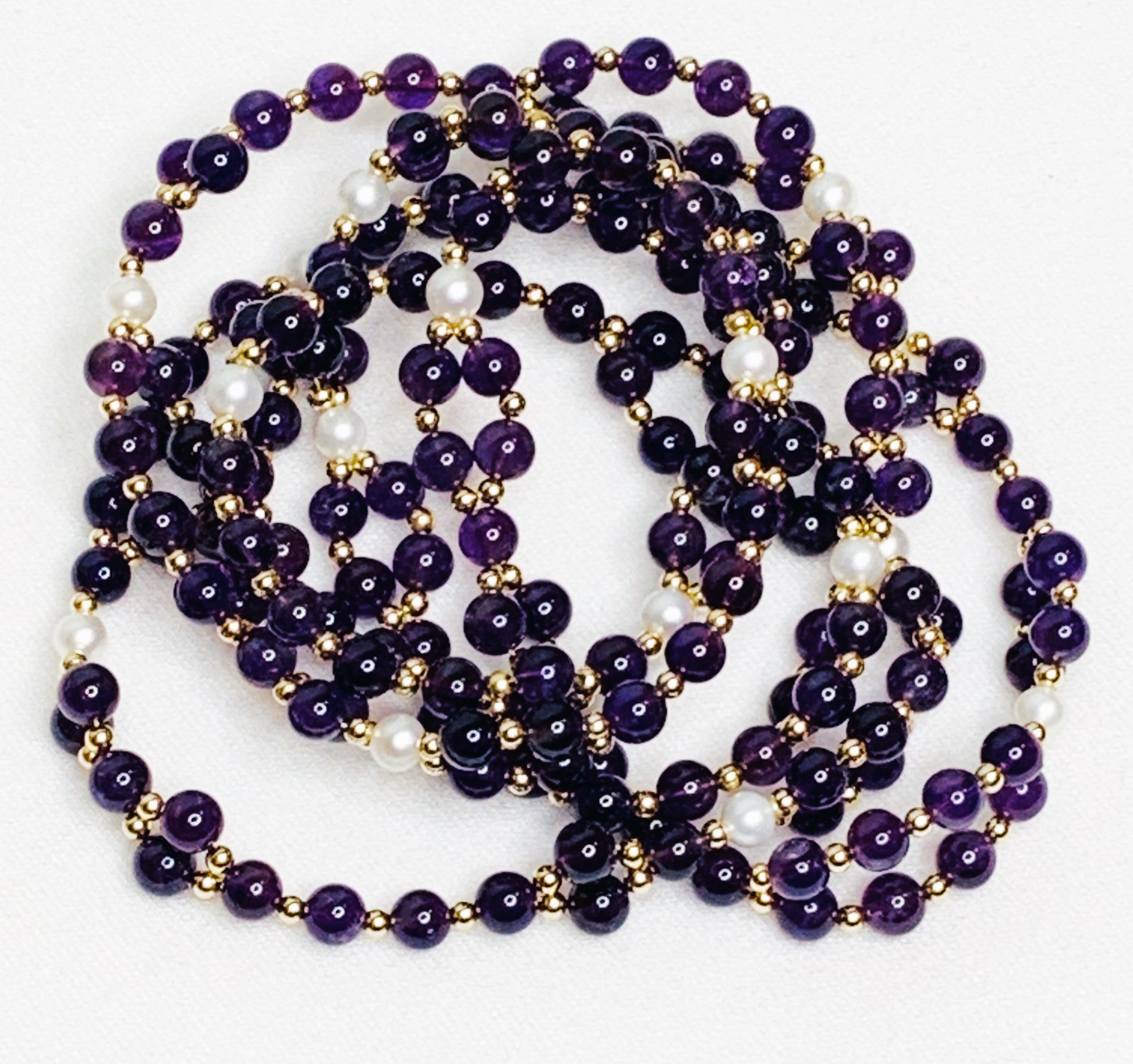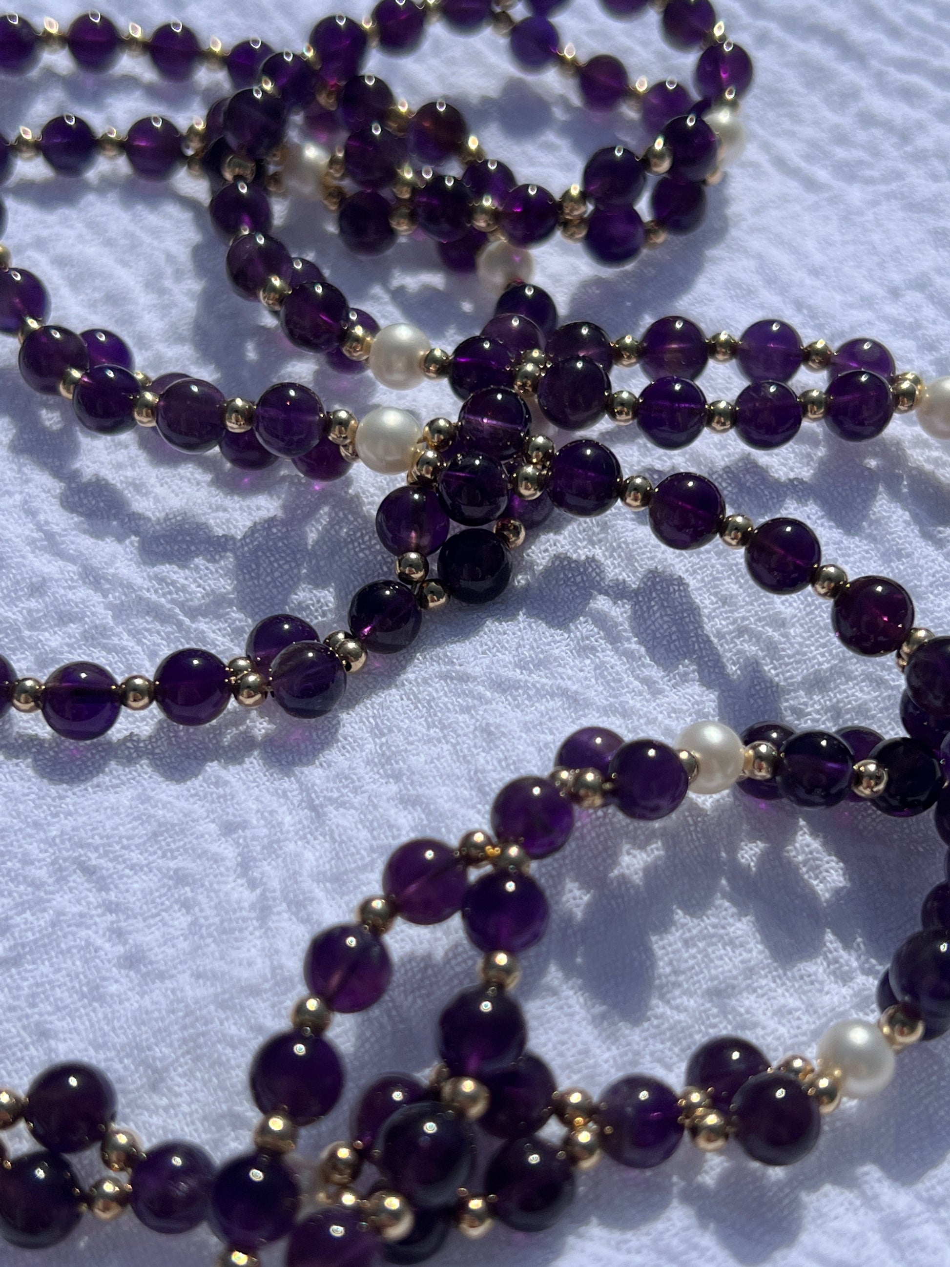 Gemstones: Amethyst with Freshwater Pearls. Amethyst is a protective and grounding stone. Often times associated with the crown chakra. Freshwater Pearls symbolize faith. Used to bring truth forward and advance in wisdom.