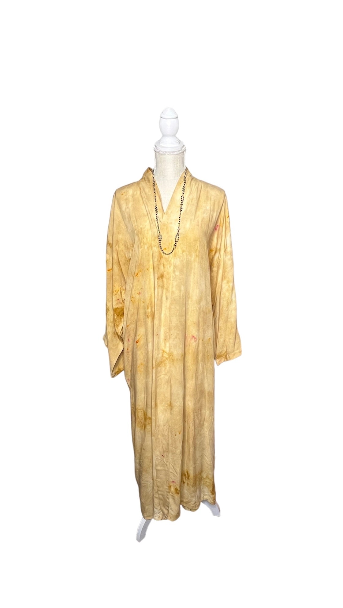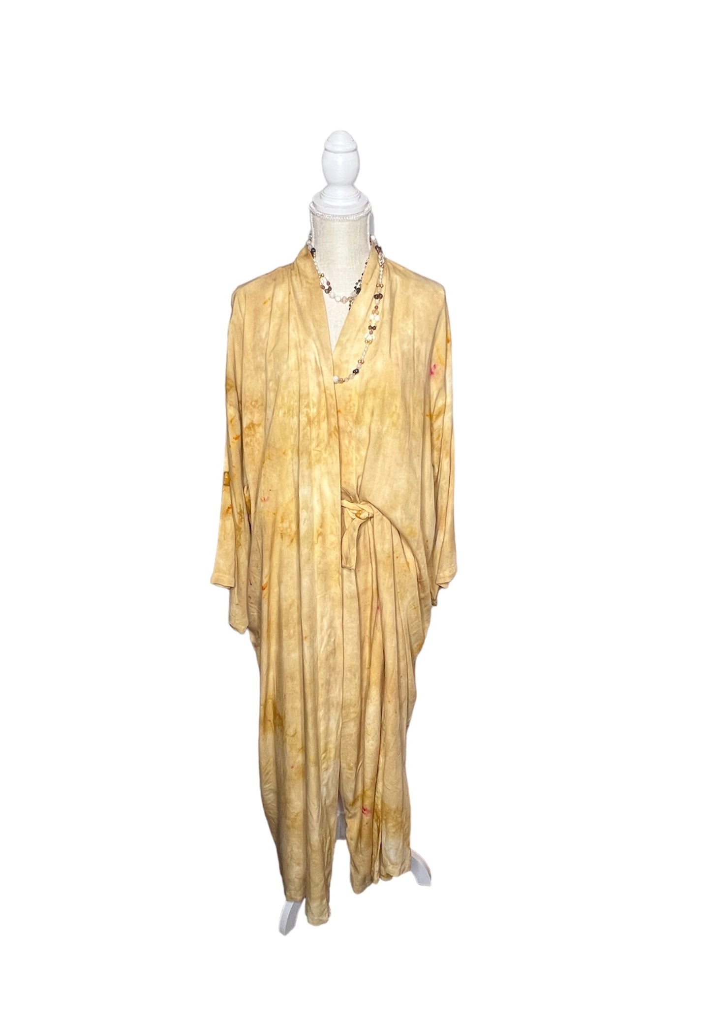 Introducing the versatile Priti Set! Featuring a Full Length Temple Coat in one size fits most, paired with S/M pants, this set is a wardrobe essential. Crafted from rayon and hand colorized with low impact dye, the coat is truly unique, offering endless styling possibilities. With measurements designed for comfort and style, the coat boasts a length of 53” and sleeves measuring 25” from the neck, while the pants feature a wide elastic band with drawstring and pockets, ensuring a flattering fit and comfort. Whether worn together or separately, this set offers countless outfit options. Plus, caring for your Priti Set is a breeze – simply wash gently in cold water and drip dry or tumble dry. With its enduring color and delicate rayon fabric, you'll look and feel great in this timeless ensemble.