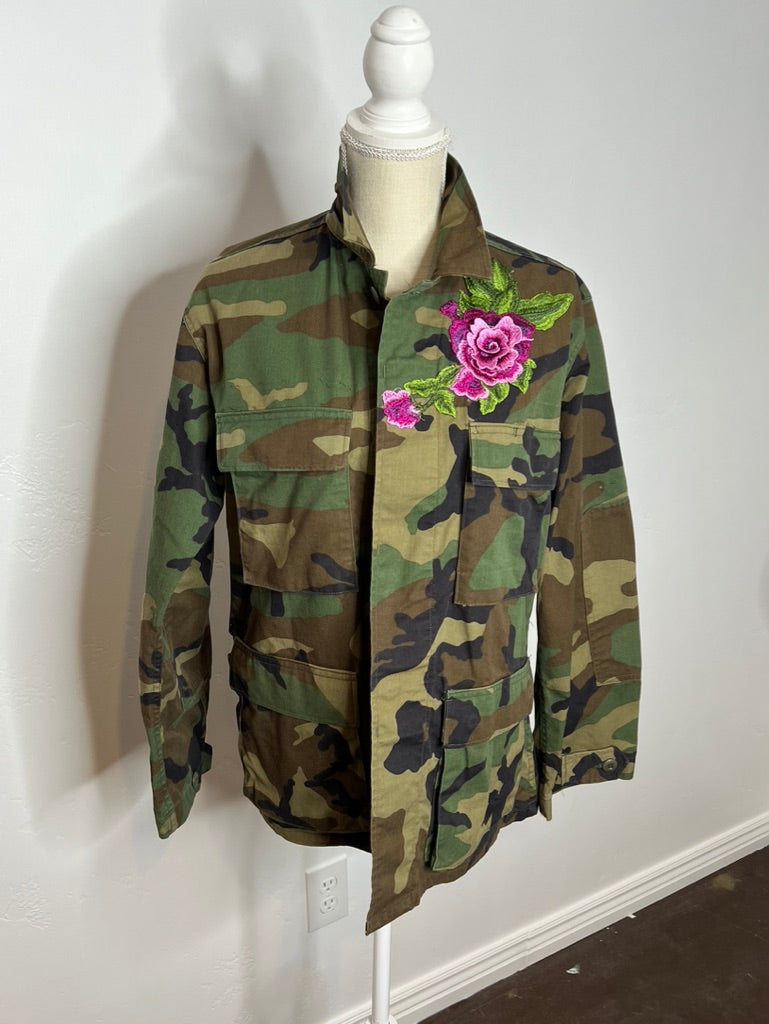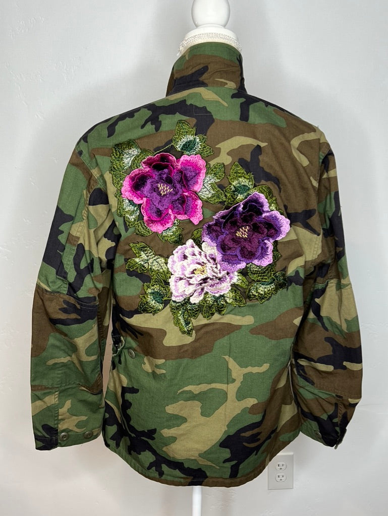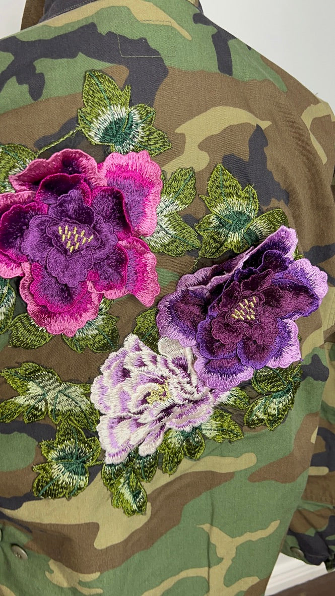 A cascade of purple and violet blooms unfurl across the jacket. This piece carries the power of wilderness and beauty blooming where it’s least expected.
