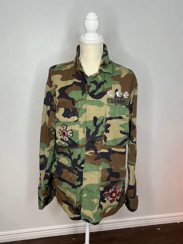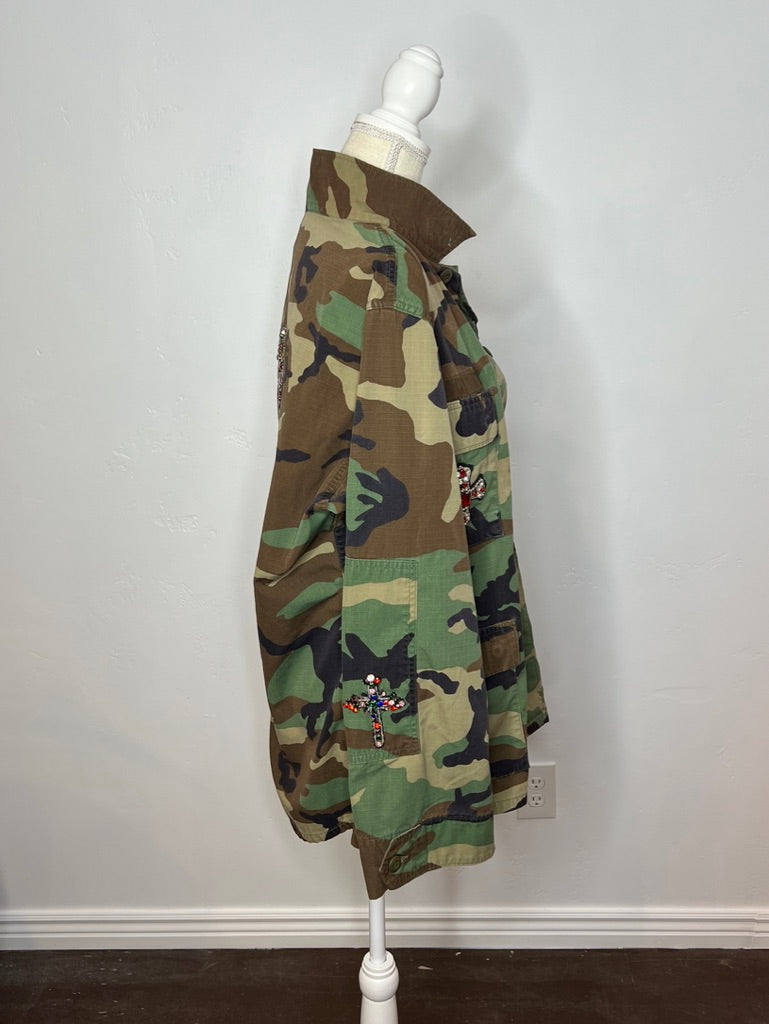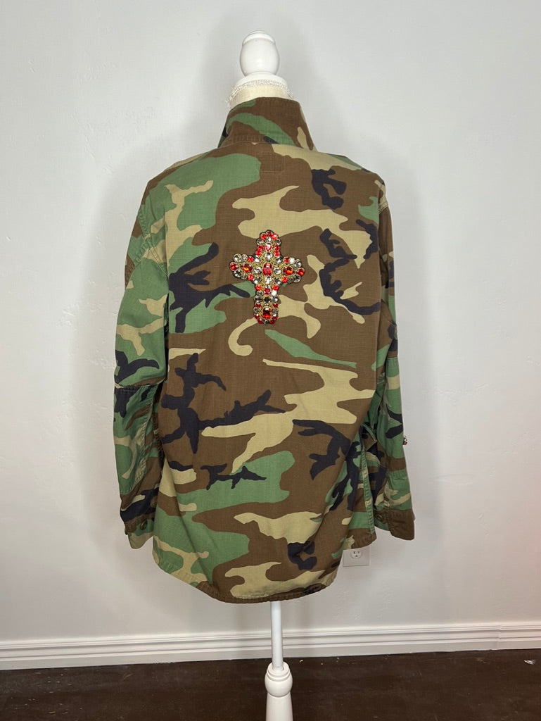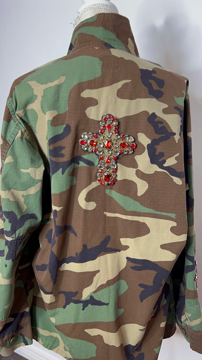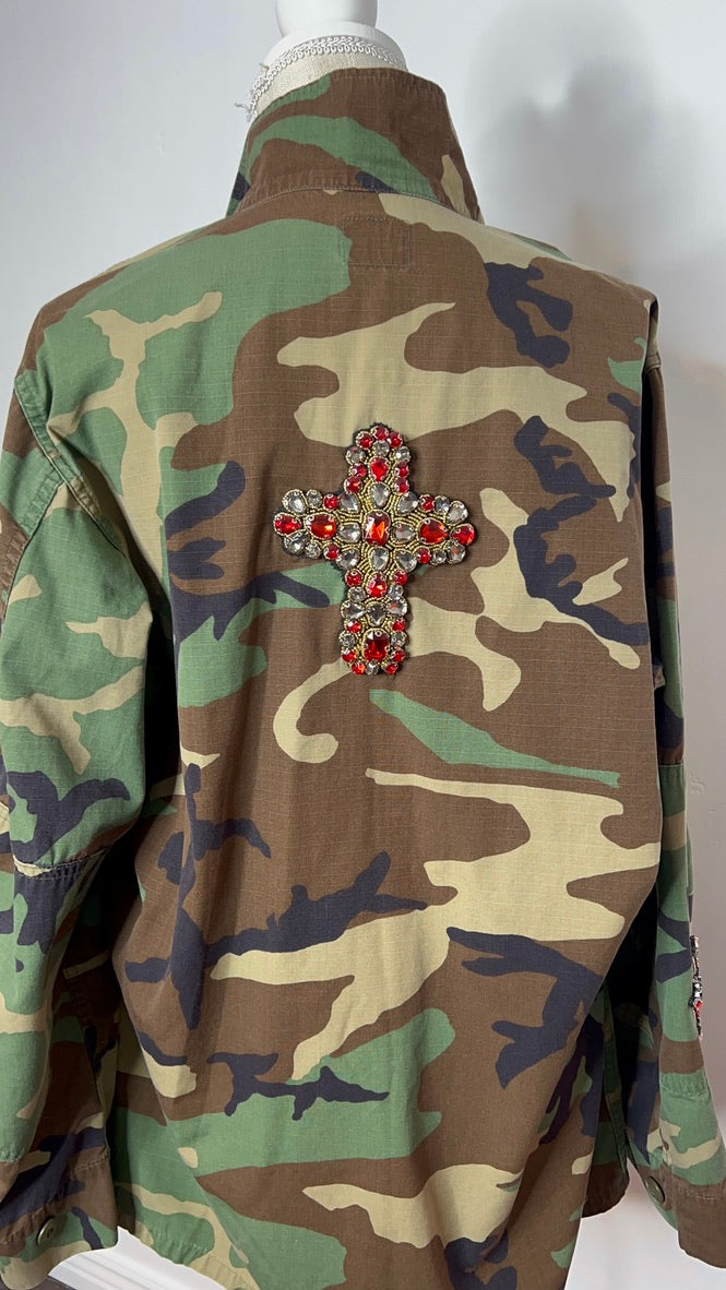 Adorned with twin crosses and three shining stars on the front, this jacket carries a bold red rhinestone cross across the back. A heart graces one sleeve, a cross the other — armor stitched for a warrior of sacred love.