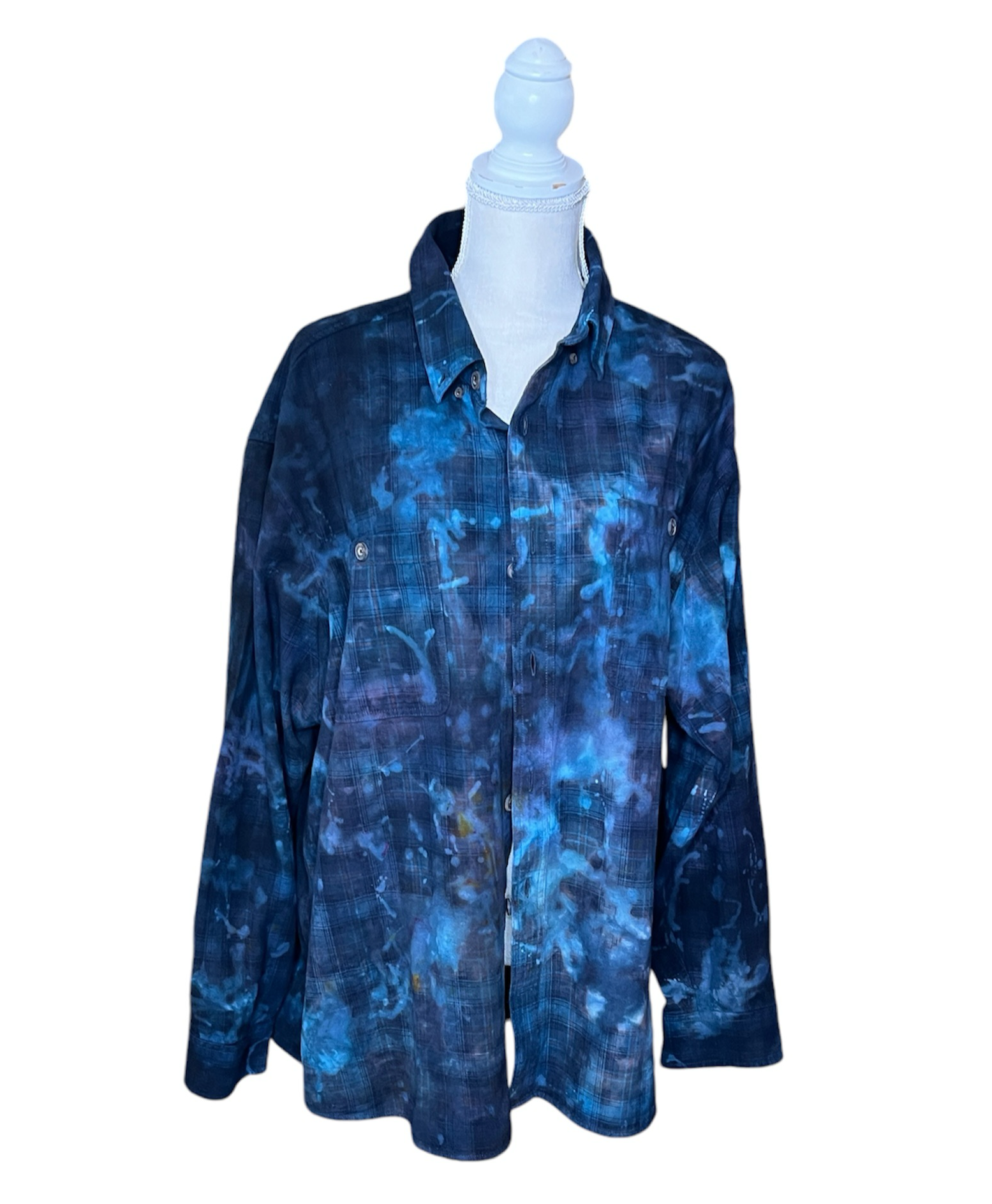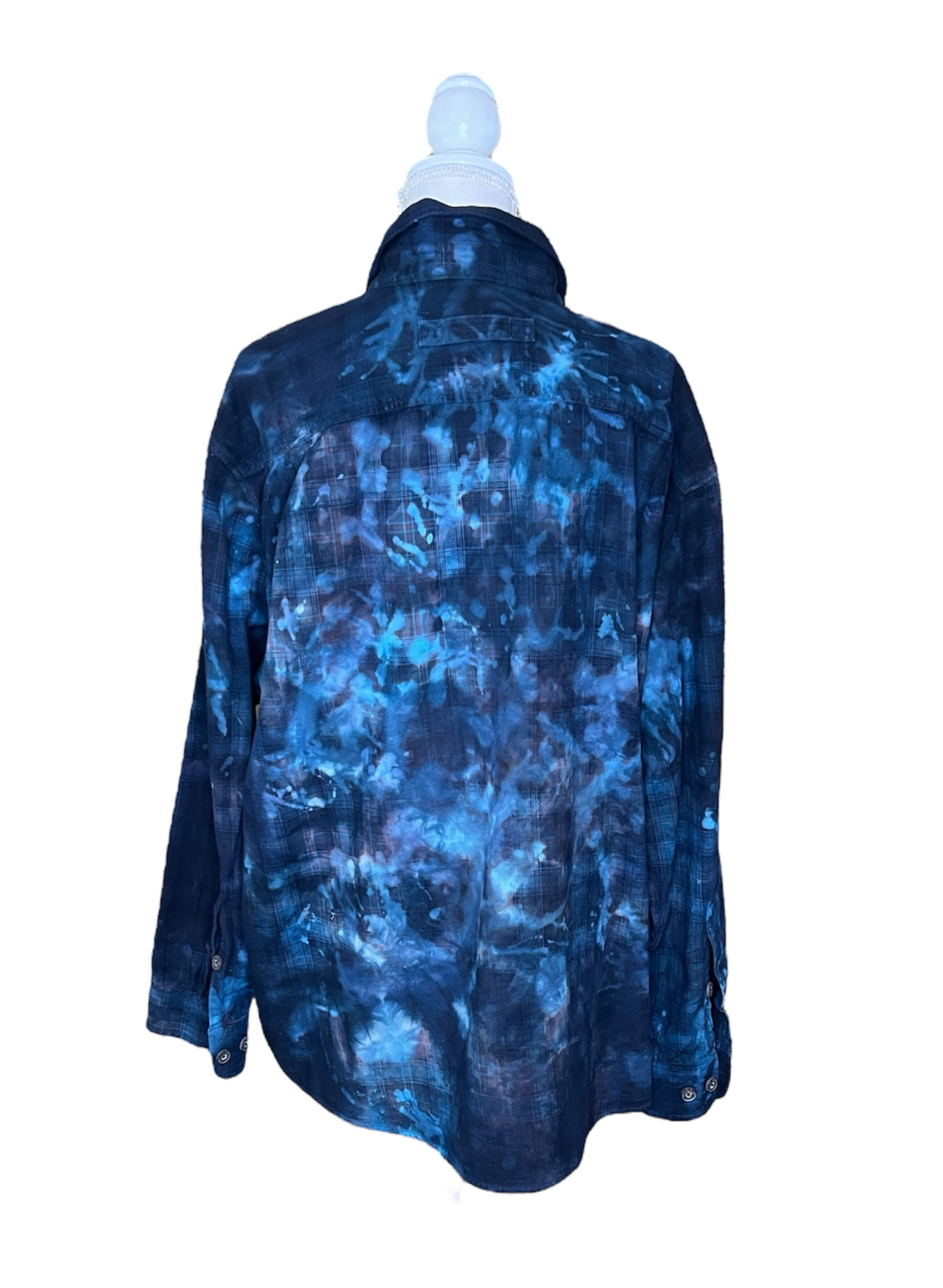 Item is unisex sizing. Each flannel is up cycled and hand dyed, making for a one of a kind piece.