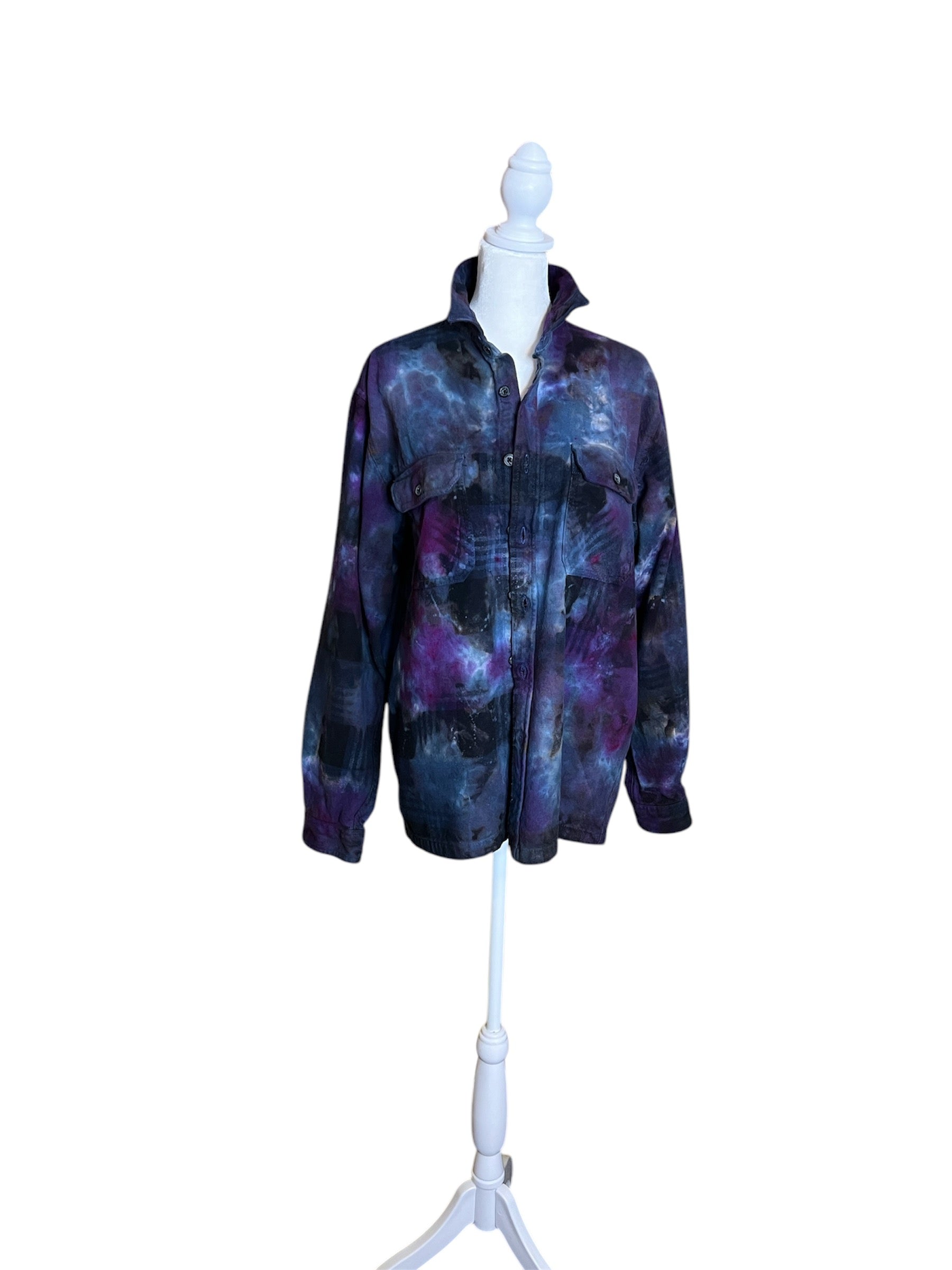 Item is unisex sizing. Each flannel is up cycled and hand dyed, making for a one of a kind piece.