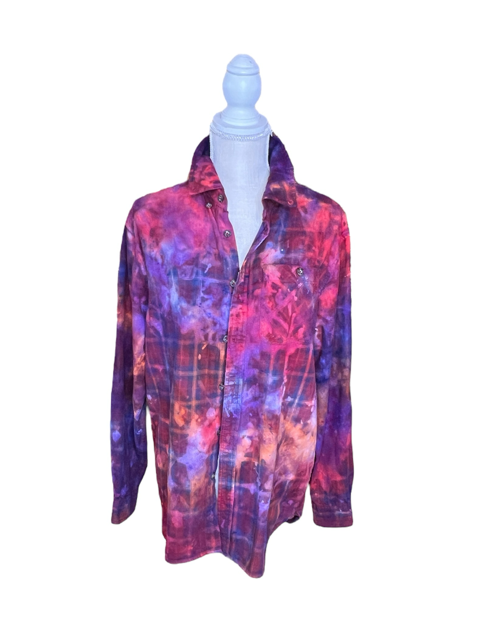 Item is unisex sizing. Each flannel is up cycled and hand dyed, making for a one of a kind piece.