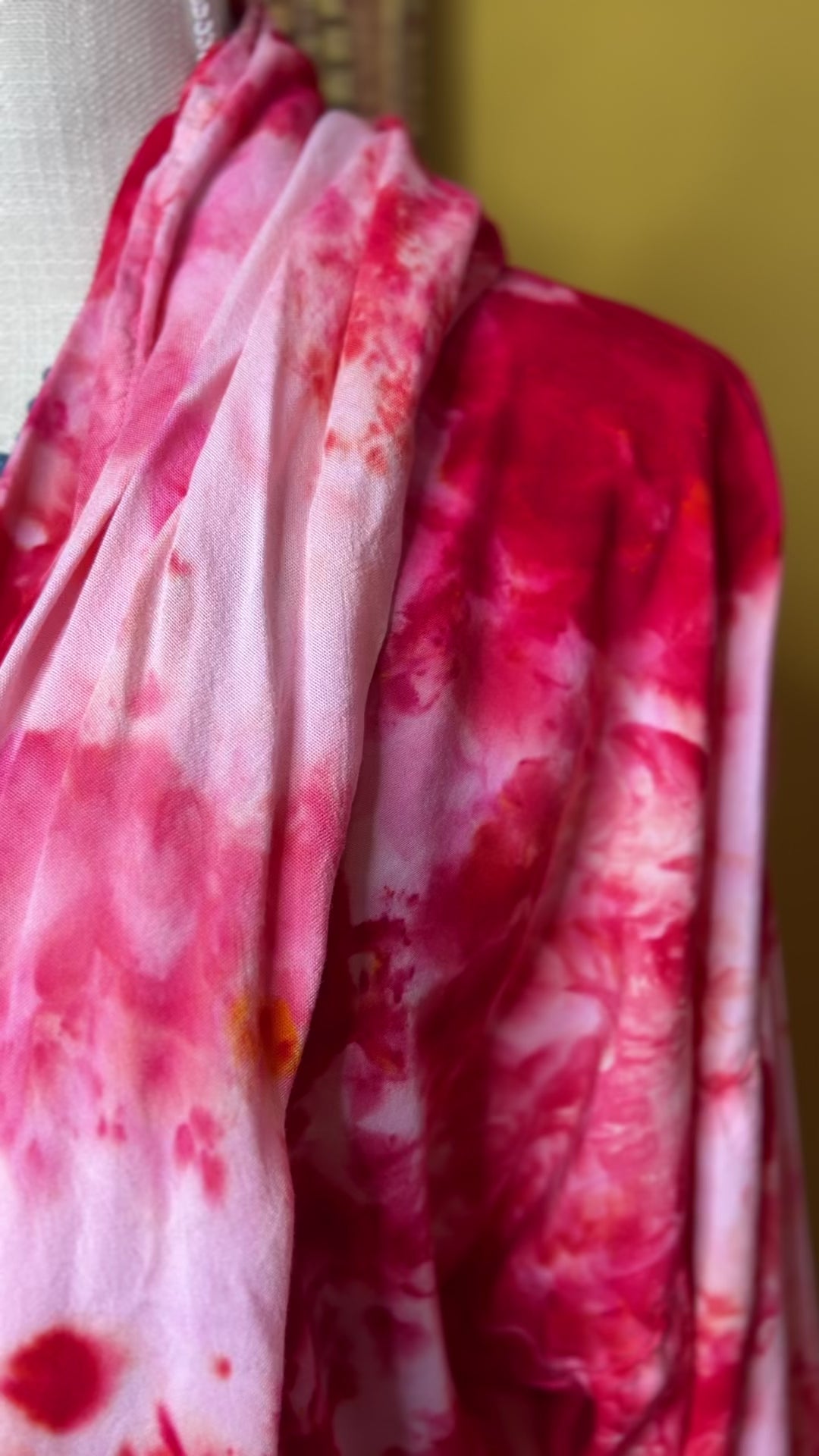Full Length Temple Coat and Turband. A bright and cheerful red with touches of yellow. Both pieces are made from rayon and hand colorized with low impact dye. Each piece is one of a kind. They can be worn together or separate. Can be worn a multitude of ways.