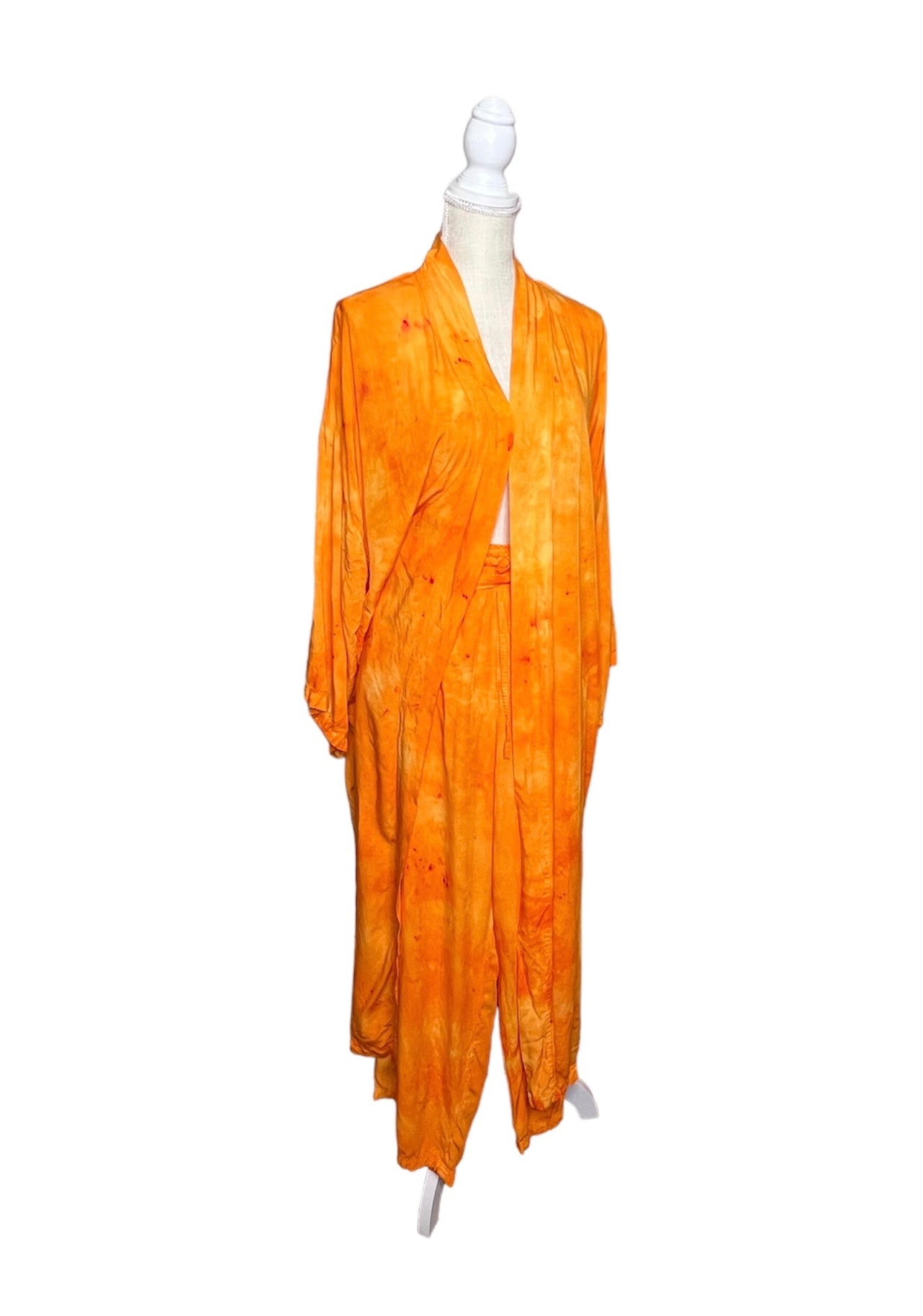 Introducing the must-have Priti Set, featuring a Full Length Temple Coat in one size fits most, paired with L/XL pants, designed for versatility and style. Crafted from soft rayon and hand colorized with low impact dye, the coat is a unique piece that can be styled in countless ways. With measurements ensuring comfort and elegance, the coat boasts a length of 53” and sleeves measuring 25” from the neck. The L/XL pants feature a wide elastic band with drawstring and pockets, offering both flattering fit and comfort. Wear the coat and pants together or separately to create endless outfit options. Plus, caring for your Priti Set is effortless – simply wash gently in cold water and drip dry or tumble dry. With enduring color and delicate rayon fabric, this set ensures you'll look and feel your best on any occasion.