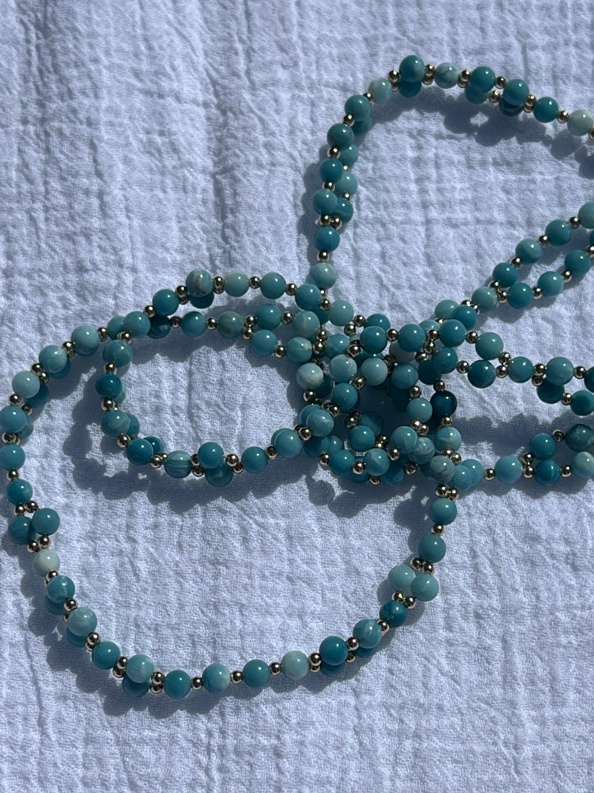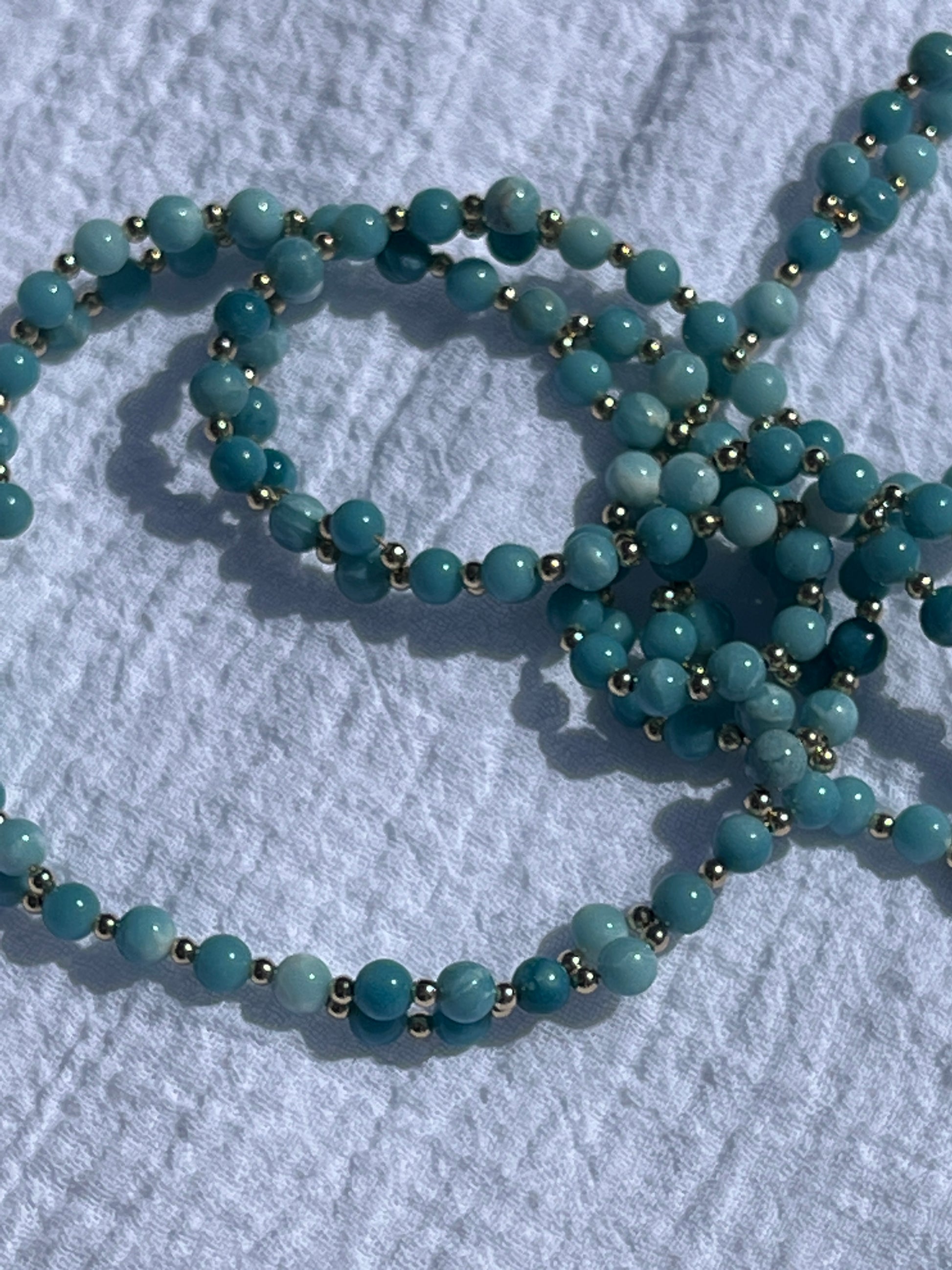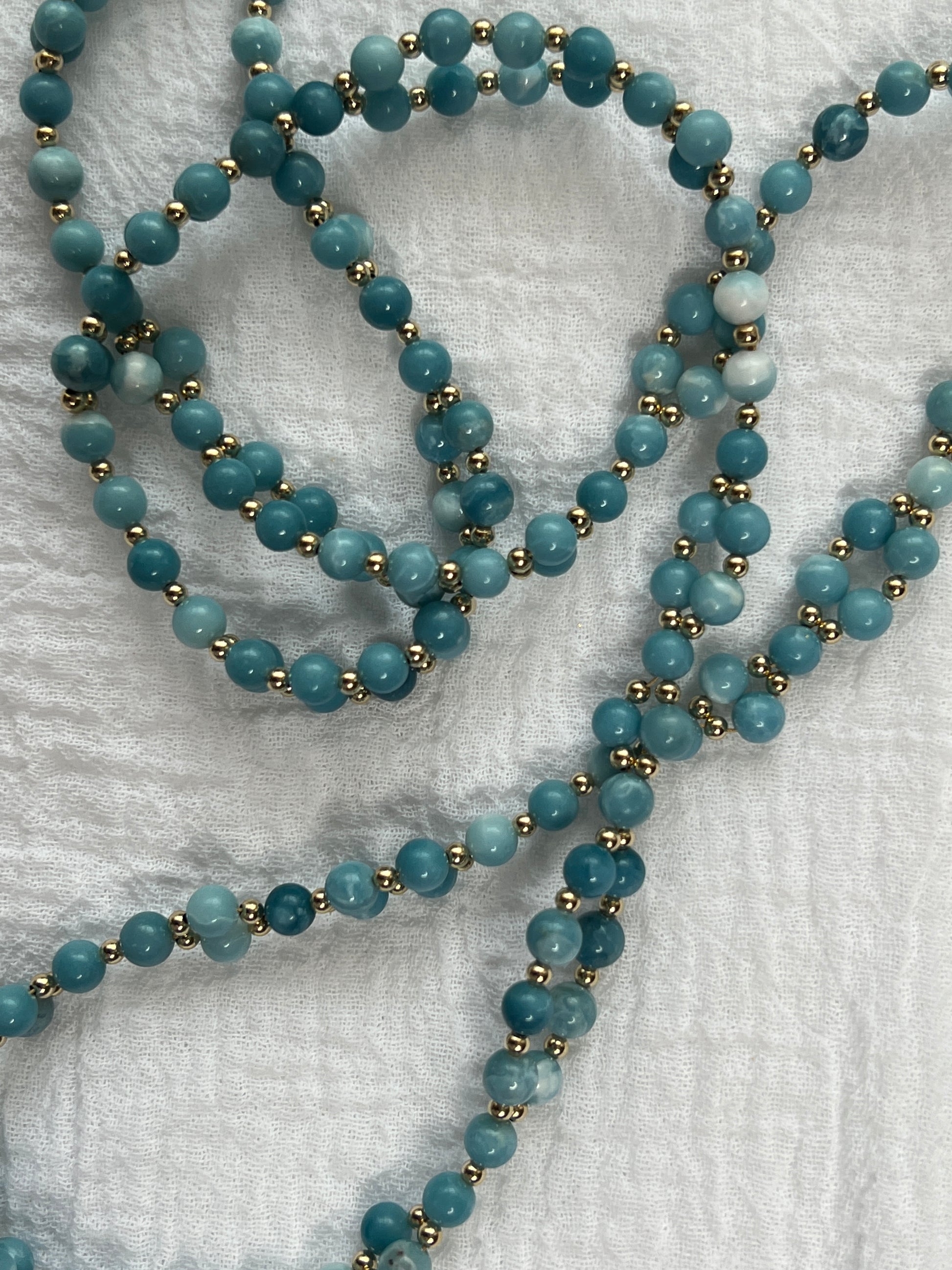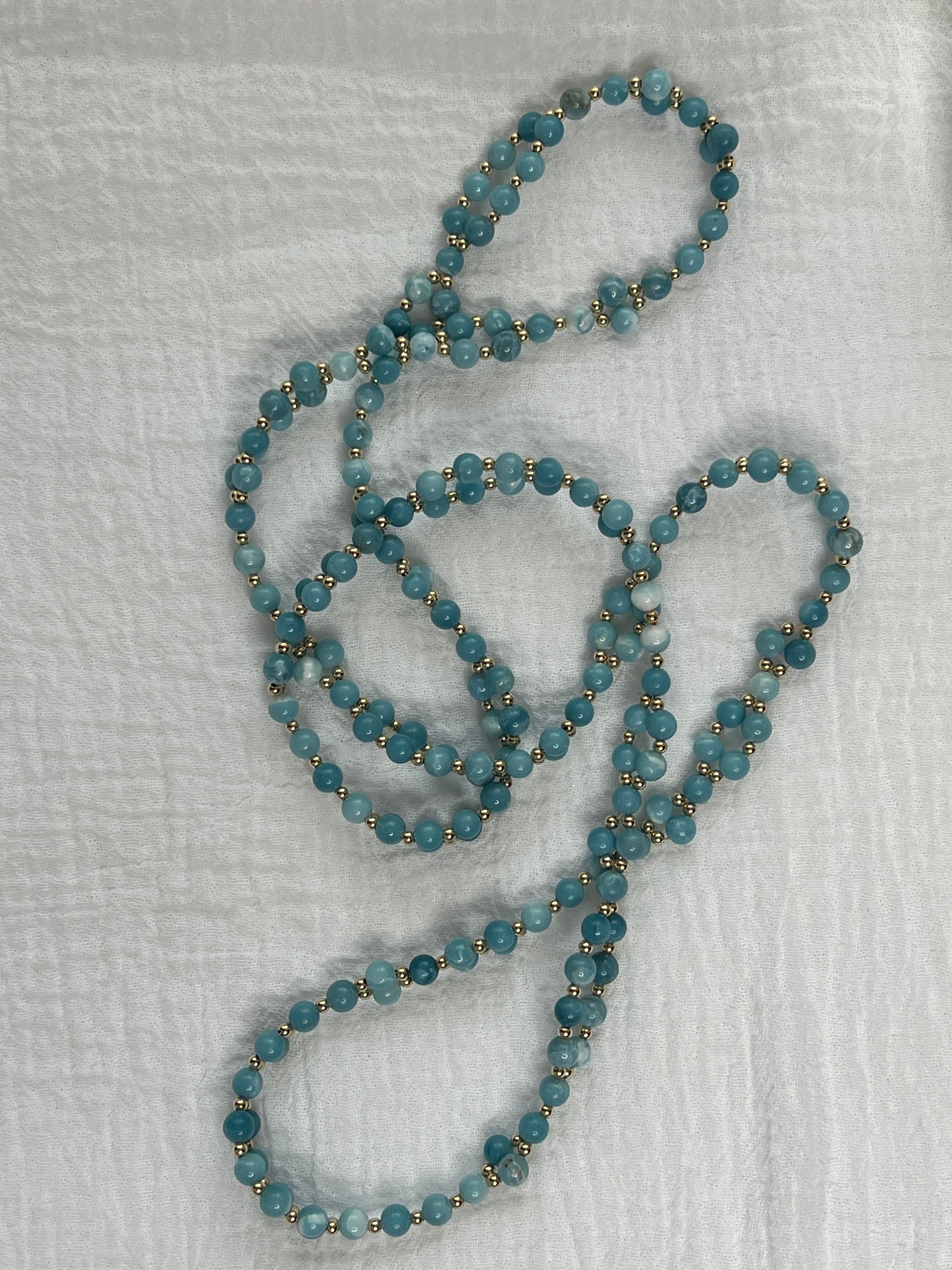 Gemstone: Larimar. Has been called the Atlantis Stone because of its ocean-like qualities. A serene crystal that promotes relaxation and calm. Can be used to alleviate anxiety. Connected to the throat chakra. Larimar assists in communication. Promotes confidence. Has an emotional healing effect that will assist you in overcoming self-sabotaging behaviour, such as martyr complexes, learned helplessness, or developing a narrative of self-victimization. A great stone for meditation as it has many positive effects.